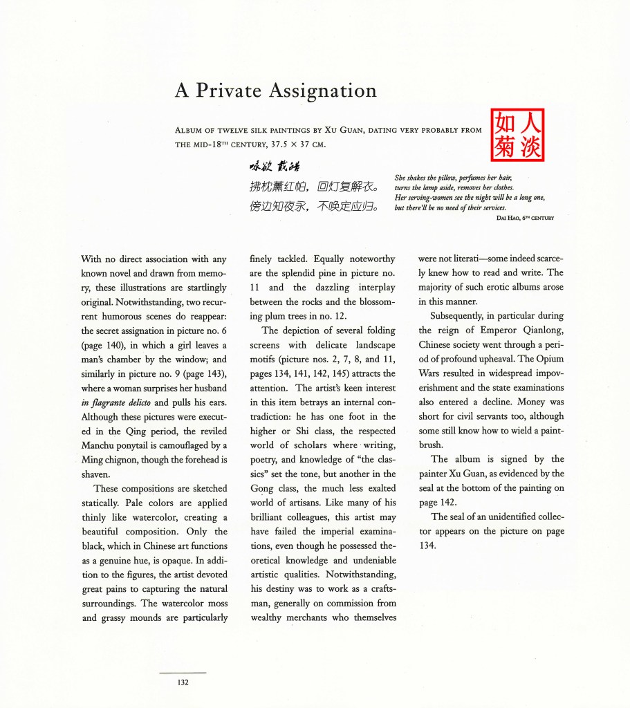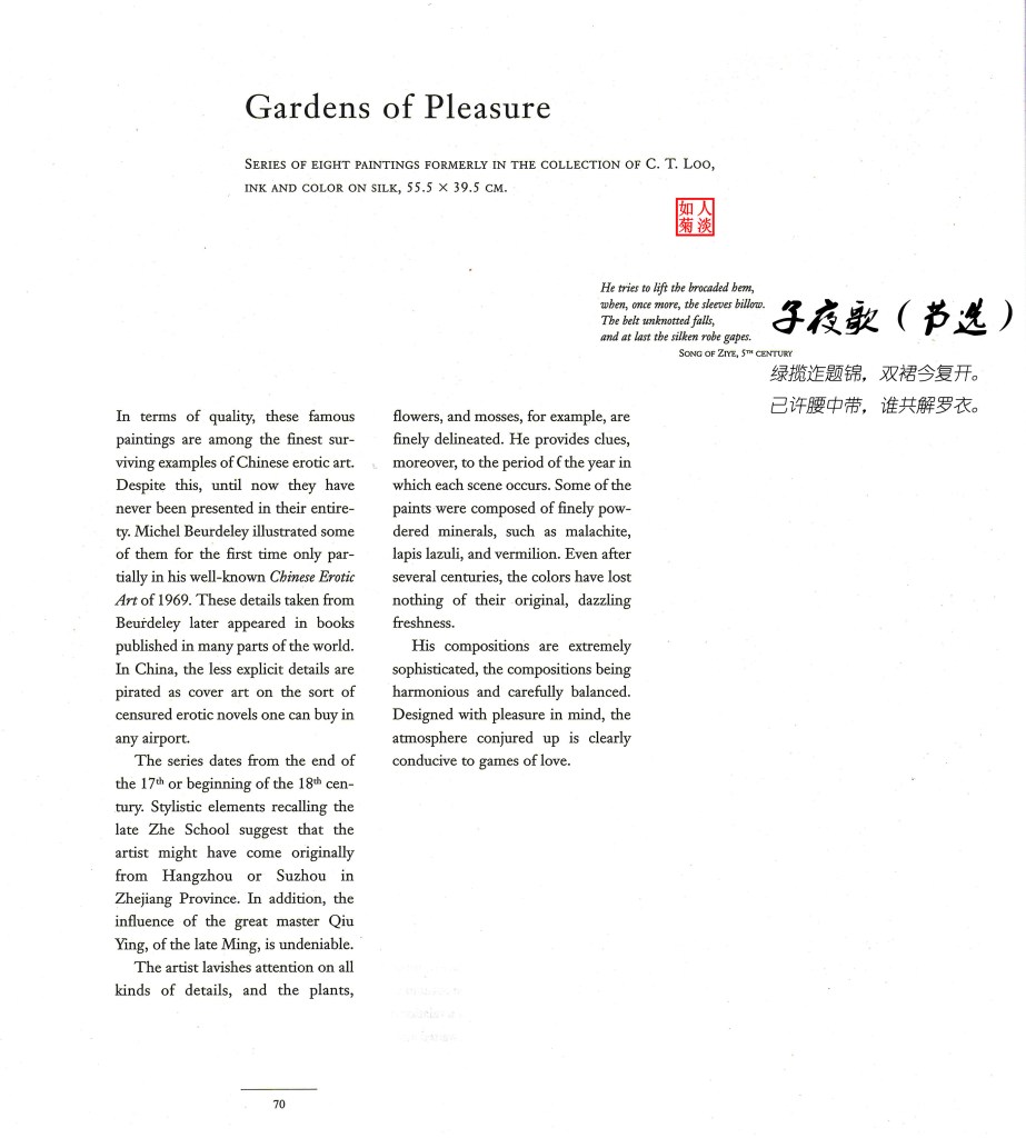 长的文章没看,感觉就是西方人写给西方人的东方情色文化科普。把画匆匆翻了一遍,大部分画配了注释,比如这一幅有夏荷,那一幅是秋菊,根据人物的衣着判断朝代,根据女性发饰判断是否出嫁等等。整体感觉就是一个藏品说明书。